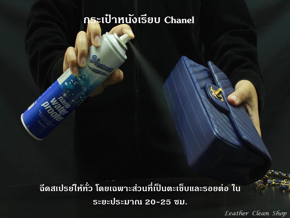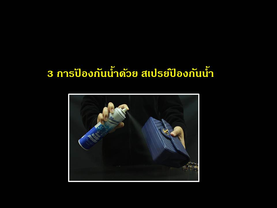 3การป้องกันน้ำ ฝุ่น และเชื้อรา โดยธรรมชาติของเครื่องหนังไม่ว่าจะเป็น กระเป๋า รองเท้า เข็มขัด โซฟา เบาะรถยนต์ หรืออุปกรณ์ที่ห่อหุ้มด้วยหนังเมื่อโดนของเหลวเช่น โค๊ก ชากาแฟ น้ำหวานหรือเหล้า จะซึมเข้าเครื่องหนังทำให้เกิดคราบในหนังเราควรจะป้องกันเครื่องหนังเป็นประจำด้วยสเปรย์ป้องกันน้ำเพื่อกันน้ำ กันฝุ่น กันรา และหนังยังระบายอากาศได้เหมือนเดิม